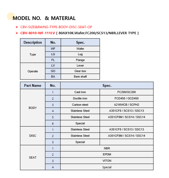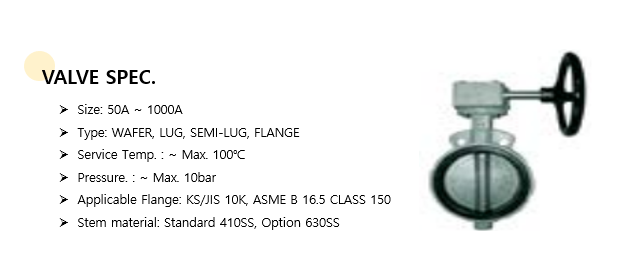 목록 본문 Concentric Butterfly Valve 동심형 버터플라이밸브 가장 일반적인 형태이며, 주로 저압 (10K이하)에 사용합니다. MODEL. CBV SIZE 50A - 1000A (2in - 40in) TYPE WAFER, LUG, FLANGE TEMP. ~ Max. 100℃ PRESS. ~ Max. 10bar APPLICABLE FLANGE KS/JIS 10K, ANSI150 상세설명