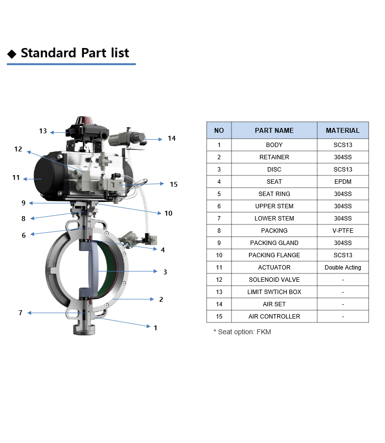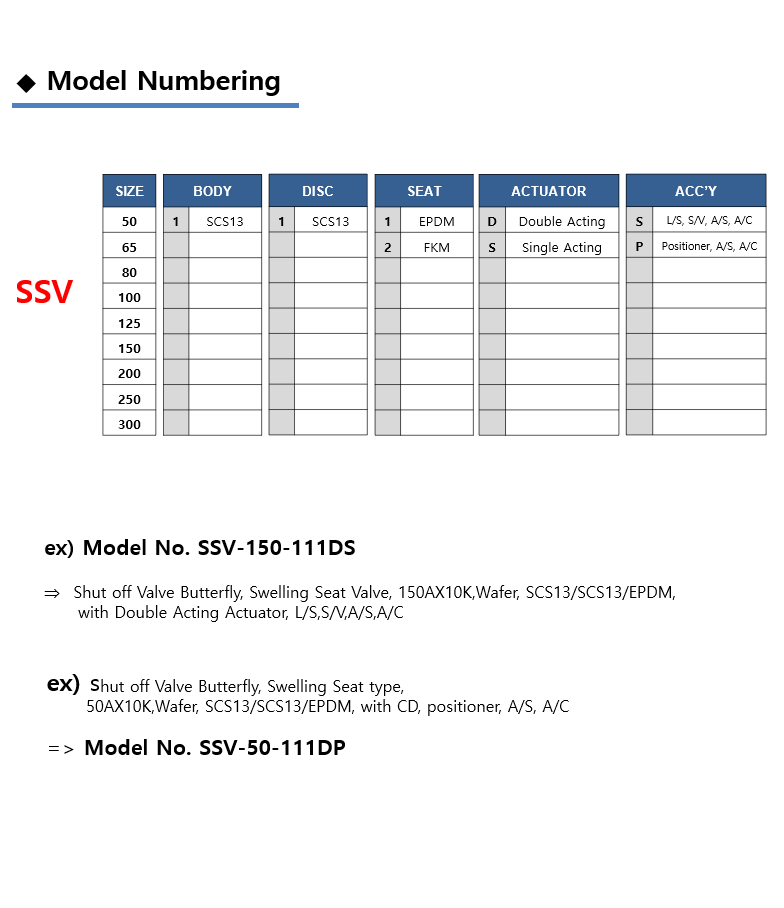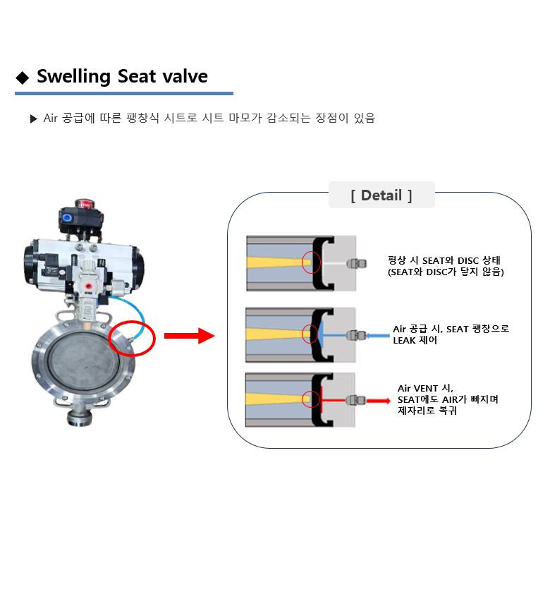 목록 본문 팽창시트밸브 ◆ 제품소개 팽창시트밸브 (Swelling Seat Valve) 1. 분체 이송라인에 적합한 디자인 2. 내식성이 강한 SCS13 BODY 3. 팽창식 시트로 시트 마모 감소 4. 회전 시 디스크가 시트에 닿지 않아 엑추에이터에 무리가 가지 않습니다. 5. 다양한 ACC’Y 부착가능 Model SSV Size 50A(2in) to 300A (12in) Press. Rating KS/JIS 10K End Conn. Wafer type Body SCS13 Disc SCS13 Seat EPDM 상세설명